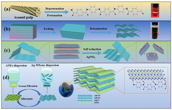 Schematic diagram of the fabrication procedure. The preparation of (a) ANFs and (b) Ti3C2Tx MXene; (c) process for in situ reduction of AgNPs on Ti3C2Tx MXene; (d) schematic illustrating the fabrication of AMAGM composite paper.