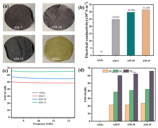 Property and EMI shielding efficiency of Ag-hybrids. (a) Digital images of Ag-MXene hybrids and ANF film. (b) Electrical conductivity; (c) EMI SE; and (d) SET, SEA, and SER of AM-5, AM-10, AM-15, and single-layered ANFs.