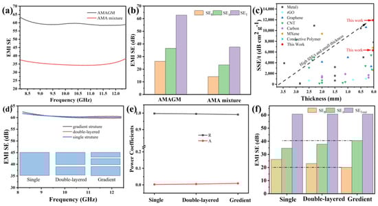 EMI-shielding performance of AMAGM composites. (a) EMI SE of composite paper with different structures in the X-band. (b) Comparison of SET, SEA, and SER. (c) Comparison of the specific EMI shielding effectiveness as a function of thickness. (d) EMI SE with different structures. (e) R and A of composite paper with different structures in 8.2 GHz. (f) Comparison of SET, SEA, and SER of composite paper with different sandwich structures.