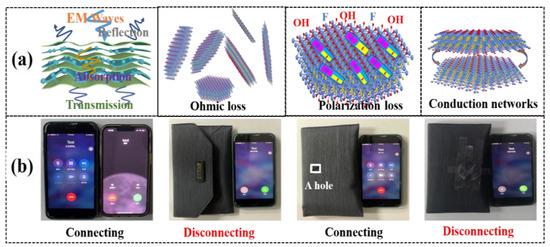Furthermore, a practical application was performed to demonstrate the EMI shielding ability of the AMAGM composite paper. A mobile phone can be freely connected with another one, as illustrated in Figure 6b. When one phone is placed in the shielding bag, the connection between the two phones is cut off because of the blocked signal resulting from the shielding bag. When the shielding bag is broken with a square hole, the phones can be smoothly connected with each other owing to the electromagnetic wave leaked through the hole. After the hole is covered by the AMAGM composite paper, indicating the electromagnetic wave being shielded again, the phones disconnect [49,50].