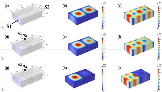 EMI shielding performance simulation of different samples. (a,d,g) The simulation models for shielding performance. (b,e,h) The electric field simulation for different models. (c,f,i) The magnetic field simulation for different models.