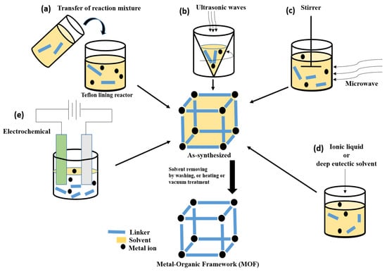 Some methods for MOF synthesis: (a) solvothermal or hydrothermal method; (b) ultra-sound assisted method; (c) microwave synthesis method; (d) ionothermal synthesis method; and (e) electrochemical synthesis method.