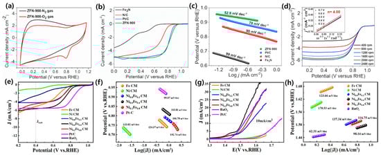 (a) CV curves of ZFN-900 in N2- and O2-saturated 0.1 M KOH solution with a scan rate of 100 mV s−1; (b) ORR polarization curves of different catalysts at 1600 rpm; (c) Tafel slopes of different catalysts derived from ORR LSV curves; (d) LSVs for ZFN-900 at various rotating speeds, inset is the corresponding K−L plot (reproduced with permission from [26]); (e) LSV; (f) Tafel slopes of samples for ORR; (g) LSV; and (h) Tafel slopes of samples for OER (reproduced with permission from [100]).