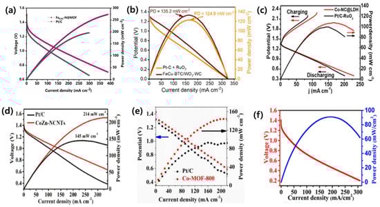 Zhang et al. developed porous Fex-N@MOF as a highly efficient catalyst for oxygen reduction over a wide pH range with a maximum power density of ca. 274 mW cm−2, which is approximately 28% greater than that of Pt/C (196 mW cm−2) in (Figure 4a) [120]. Paudel et al. functionalized metal nodes–organic bridge ligands that were integrated on polyvalent tungsten oxide–carbide interfaces with highly porous nano-dendritic architecture. Thus, the formed FeCu-BTC/WO-WC showed a power density of 135.2 mW cm−2 (Figure 4b) for ZAB [20]. Similarly, Chen et al. synthesized a composite (Co-NC@LDH) by anchoring NiFe-layered double hydroxide (NiFe-LDH) nanosheets on the surface of a ZIF-derived carbon-based framework. It showed a high peak power density (107.8 mW cm−2) (Figure 4c) and excellent durability (over 300 h) when used in ZAB [25]. Liu and a team of researchers constructed (CoZn-NCNTs) composite by Co nanoparticles embedded in like N-doped carbon nanotubes, which showed a high-power density of 214 mW cm−2 (Figure 4d) with a voltage retention of 99.4%, in ZAB [105]. Likewise, Duan et al. constructed novel Co-MOF, O-doped carbon (Co-MOF-T) based on Zn, Co-doped glucosamine, and ZIF-8. The primary Zn–air batteries using a Co-MOF-800 air electrode achieved a high open-circuit voltage of 1.38 V, a specific capacity of 671.6 mAh g−1, and a prominent peak power density of 144 mW cm−2 (Figure 4e) [107]. Furthermore, Li and co-authors synthesized FeS/Fe3C nanoparticles embedded in a porous N, S-dual doped carbon honeycomb-like composite (FeS/Fe3C@NS-C-900). It demonstrated a power density of 90.9 mW cm−2 (Figure 4f), a specific capacity of 750 mAh g−1, and cycling stabilities over 865 h (1730 cycles) at 2 mA cm−2 for rechargeable ZAB [108].