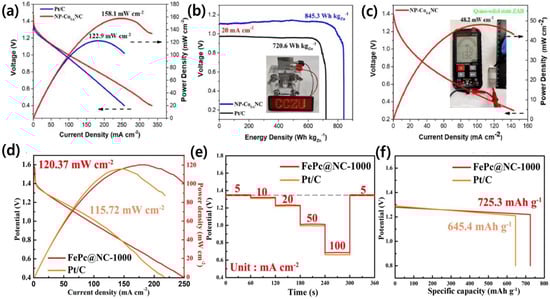 Rong et al. prepared a two-dimensional nanoporous Co single-atom decorated nitrogen-doped carbon catalyst (NP-CoSANC) by the pyrolysis of urea-adsorbed Co-TPyP MOF precursor, which displays the peak power density of 158.1 mW cm−2 at the current density of 249.0 mA cm−2, exceeding that of Pt/C + RuO2 (Figure 5a). Additionally, at the current density of 20 mA cm−2, the aqueous primary ZAB with NP-CoSANC air cathode shows a higher voltage platform than that of Pt/C + RuO2 air cathode (Figure 5b). Interestingly, an aqueous primary ZAB with NP-CoSANC air cathode can steadily light up a LED panel, suggesting its real-time application and favorable prospects in power devices (inset in (Figure 5b)). The quasi-solid-state ZAB shows a high open circuit voltage of 1.321 V under a flat state in ambient air (inset in (Figure 5c)) [121]. Moreover, Dong et al. reported that FePc@NC-1000 delivered a higher power density of 120.37 mW cm−2 compared to Pt/C, indicating good mass transfer kinetics (Figure 5d). As portrayed in Figure 5e, the ZABs upheld a relatively steady output voltage from 5 to 100 mA cm−2. Furthermore, upon returning the current density to 5 mA cm−2, the discharge voltage of the ZABs resumed to its initial value, indicating high rate capability and durability. The specific capacity of the ZAB based on FePc@NC-1000 (725.3 mAh g−1) is significantly higher than that of Pt/C (645.4 mAh g−1) discharged at 10 mA cm−2 (Figure 5f). Overall, the FePc@NC-1000 proves to be an appropriate Pt-free cathode catalyst with significant applications [122].