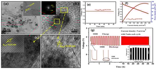 (a) TEM and (b–d) HRTEM images of Co0.25Ni0.75@NCNT30. Inset (a) highlights the HRTEM image of a chosen NCNT, while insets (b) and (c) exhibit SAED and inverse Fast Fourier-transform (FFT) patterns, respectively (Scale of inset of (b) is 10 1/nm); (e) Co0.25Ni0.75@NCNT30-based ZAB is characterized by open-circuit voltage; (f) discharge polarization curve and power density plot; and (g) galvanostatic charge–discharge cycling performance. A magnified section of the discharge profile (initial two cycles) is portrayed in the left inset of (g); and the right inset features the plot of charge–discharge voltage gap versus cycle number (reproduced with permission from [109]).