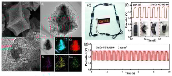(a) FESEM image; (b,c) HRTEM image (scale bar of (b) is 200 nm and (c) is 5 nm); (d) elemental mapping analysis of Mn/Co-N-C-0.02-800; (e) visual manifestation of practical implementation is provided in through a photographic representation depicting a LED aglow, orchestrated by an interconnected sequence of three all-solid-state ZABs; (f) cyclic stability of all-solid-state Mn/Co-N-C-0.02-800 ZAB tests under different bending states (subfigures (f1–f4)) as presented at 2 mA cm−2 with per cycle period of 10 min; (g) galvanostatic discharge-charge cycling behavior of the Mn/Co-N-C-0.02-800 all-solid-state zinc–air battery (reproduced with permission from [111]).