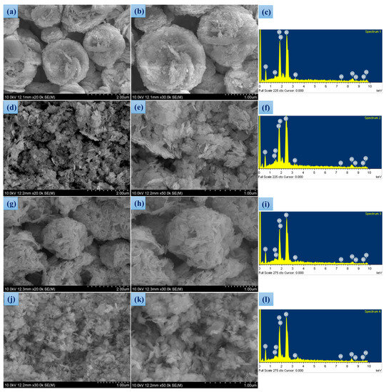 FE-SEM images and EDAX analysis: BW (a–c), BW-C (d–f), BW-T (g–i), and BW-K (j–l) samples.