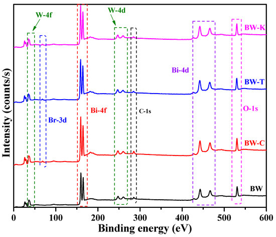 The 312 cm−1 peak is assigned to the translation modes involving the simultaneous motions of Bi3+ and WO66− ions. The peaks observed at 720, 800, and 831 cm−1 correspond to the symmetric and asymmetric stretching of WO6 [41,42]. Another peak at 424 cm−1 is associated with the bending mode of WO6. In comparison to the BW sample, an extra peak around 122 cm−1 was observed in the BW-C, BW-T, and BW-K samples, representing the formation of Bi-Br bond vibrations, which are a consequence of Br-containing BW NSs [43,44]. Thus, it was concluded that extra Bi-Br bonds were formed.