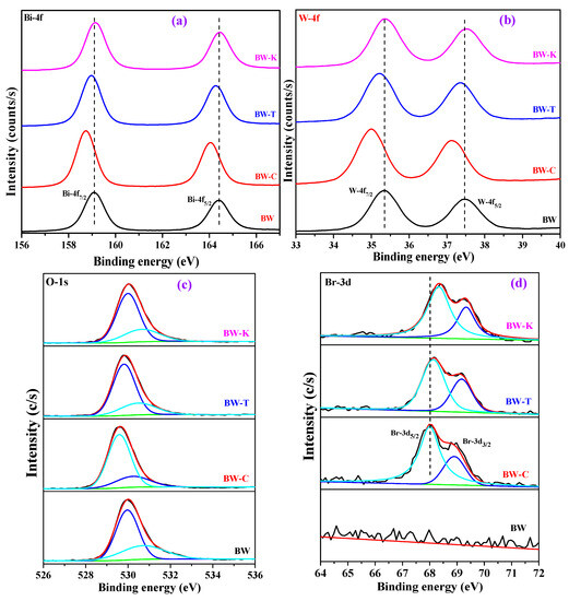 The chemical compositions and oxidation states of the constituent elements in the prepared Bi2WO6 nanostructures were studied via X-ray photoelectron spectroscopy (XPS). As shown in Figure 5, the XPS survey scan spectra of the BW sample displayed peaks related to Bi, W, and O. Furthermore, due to the presence of Br ions in the BW-C, BW-T, and BW-K samples, their survey scan spectra displayed Br-3d peaks, in addition to Bi, W, and O elements. As shown in Figure 6a, the binding energy values in the BW samples at 159.10 and 164.42 eV were attributed to the Bi-4f7/2 and Bi-4f5/2, respectively, of Bi3+, with a well-separated spin-orbit component of Δ = 5.3 eV [45]. Moreover, the high-resolution spectrum of W-4f shown in Figure 6b exhibited peaks at 35.30 and 37.47 eV (with Δ = 5.3 eV) corresponds to the W-4f7/2 and W-4f5/2 energy levels, respectively, with an oxidation state of +6 [20]. Figure 6c presents the O-1s spectrum of the BW sample. As shown, the deconvolution spectrum shows two peaks around 530.0 and 531.0 eV, which are characteristic of lattice oxygen and surface-adsorbed oxygen from the atmosphere, respectively [46,47]. The high-resolution spectra of other BW samples are also included for comparison and clearly show a shift in the binding energy values. Figure 6d provides the high-resolution Br-3d spectra originating from the Br− ion-based precursors used to prepare Bi2WO6 ultrathin nanosheets. As shown, the BW sample did not exhibit any Br-3d spectrum, whereas the remaining samples showed well-resolved peaks around 67.40 and 68.44 eV for BW-C, 67.90 and 68.94 eV for BW-T, and 68.05 and 69.10 eV for BW-K [35]. These peaks indicate that the Br− ions from CTAB, TBAB, and KBr were bonded to the surface Bi atoms in the layered structure. Consequently, the morphology was converted to that of typical ultrathin nanosheets. Notably, the XPS signals of Bi, W, and O in Figure 6 shifted toward lower binding energies after adding Br-based precursors to the reaction medium. This phenomenon was due to the formation of chemical bonds between Br and Bi2WO6 (Bi-O-Br), resulting in a change in the charge distribution in the host component, Bi2WO6. Because Bi2WO6 has a layered perovskite structure consisting of alternating [Bi2O2]2+ and [WO4]2− layers, bromine is conducive to being inserted into the interlayer [38,48]. The interaction between the Br− ions and Bi2WO6 caused the XPS peaks to shift toward a lower binding energy.