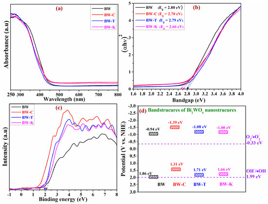 To determine the light-harvesting nature of the synthesized Bi2WO6 samples, UV-vis absorption spectra were recorded, as presented in Figure 8a. The plots in Figure 8a show that all the BW samples exhibited weak visible-light absorption, with an absorption band edge of approximately 450 nm and slight changes. These slight changes in the absorption edges of the Bi2WO6 samples are due to the change in morphology from microspheres to nanoplatelets. The bandgap energies of the prepared Bi2WO6 samples were determined using the absorbance data shown in Figure 8a, and their corresponding Tauc plots [50] are shown in Figure 8b. As shown, the bandgap energies of the BW, BW-C, BW-T, and BW-K samples are 2.80, 2.70, 2.79, and 2.66 eV, respectively. As discussed in Section 3.1, the adsorbed Br− ions on the surface reduce the bandgap energy of the nanoplatelets. The Bi atoms were coordinately unsaturated on the surface, resulting in layered surfaces that exposed a large number of reactive sites (i.e., an increased specific surface area, as shown in Figure 7). Under visible-light irradiation, holes are directly produced on the surfaces and electrons in the middle layer, leading to efficient charge separation. Both the improved specific surface area and efficient charge separation result in higher photocatalytic activity [36]. To calculate the valence band positions (EVB) of the prepared Bi2WO6 samples, valence band XPS (VB-XPS) spectra were recorded (Figure 8c). The EVB values of BW, BW-C, BW-T, and BW-K were determined to be 2.10, 1.55, 1.95, and 1.90, respectively. Measurement errors were removed using the following equation: EVB = φ + VBxps − 4.44 eV, where φ with 4.2 eV and 4.44 eV corresponds to the work-function of the XPS analyzer and the vacuum level, respectively [1]. Then, the final VB positions in the band structure of the Bi2WO6 system were calculated as 1.86, 1.31, 1.71, and 1.66 eV for BW, BW-C, BW-T, and BW-K respectively. Furthermore, by using Equation (1) [51],