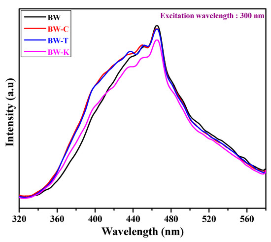 To determine the electron-hole recombination rate of the prepared photocatalytic systems, room-temperature steady-state photoluminescence (PL) spectra were obtained. Generally, a photocatalytic system that exhibits a lower PL intensity has a low electron-hole recombination rate; therefore, higher photocatalytic activity is observed [53]. The PL spectra were recorded at an excitation wavelength of 300 nm, as shown in Figure 9. All the PL spectra of the BW samples show similar features, and the emission band centered at approximately 465 nm is characteristic of the band-to-band transition seen in Bi2WO6. As shown in Figure 9, the PL intensity quenching in the BW-K sample indicates a decreased charge recombination rate, which improves the photocatalytic activity.