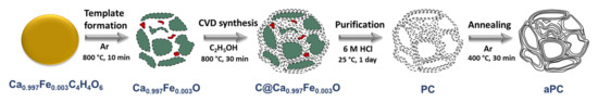 - Shlyakhova, E.V.; Okotrub, A.V.; Fedoseeva, Y.V.; Fedorovskaya, E.O.; Mel’gunova, E.A.; Mel’gunov, M.S.; Koroteev, V.O.; Makarova, A.A.; Zhou, J.; Song, H.; et al. Iron induced porosity of the templated carbon for enhancement of electrochemical capacitance. Appl. Surf. Sci. 2021, 543, 148565. [Google Scholar] [CrossRef]
