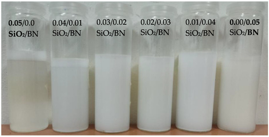 The nanofluid samples were prepared at one total volumetric concentration (0.05 vol.%) for each sample. Two types of NPs which were used to prepare the MNFs and HNFs are BN (about 70 nm in size with a purity of 99%, as provided by the supplier- Iolitec Nanomaterials, Germany) and SiO2 (about 20 nm in size with a purity of 99%, as obtained from the same supplier—Iolitec Nanomaterials, Germany). The nanoparticles’ concentration in HNFs was set to be 0.05 vol.% with four different percentages of these two NPs (0.01/0.04, 0.02/0.03, 0.03/0.02, and 0.04/0.01 (BN vol.%/SiO2 vol.%)). In addition, two MNF samples—one with the BN NP and the other with the SiO2 NP—were prepared at 0.05 vol.% concentration for each. The base fluid (BF) for both MNFs and HNFs was EG/DW mixture at 15/85 (vol.%/vol.%) for all the samples. The selection of the aqueous EG/DW comes from their common usage in industrial applications for heating and cooling [24,25,26]. Each sample of 0.5 liter was prepared as needed for running the experiment. After determining the weight of each type of NP to obtain the desired concentration, the dispersion of the NPs into the BF was performed first by mixing for 20 min via a magnetic stirrer, then a sonication process for 25 min at 40 kHz frequency using an ultrasonicator (UP200Ht from Hielscher, Germany). The latter enabled good homogenization and stability of the resulting NFs. The prepared MNF and HNF samples are shown in Figure 1.