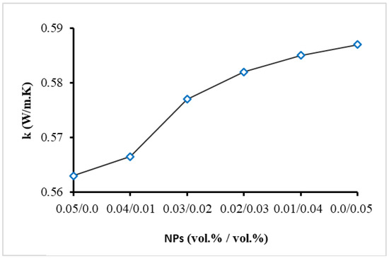 Thermal conductivity has been considered a key thermal property for NFs’ performance in thermal management applications. The thermal conductivity of the MNFs and HNFs was measured at room temperature (19 °C) using the Thermal Properties Analyzer from METER, USA, which works on the popular transient hot-wire method that has been commonly used for NFs and thus is not detailed here. Several measurements for the MNFs and HNFs were conducted considering a break time of 25 min. Furthermore, a calibration process of this device was performed using the BF, and the highest deviation was found to be around ±1.4% compared to the standard reference. The obtained experimental results for the thermal conductivity of the MNFs and HNFs are demonstrated in Figure 2, which shows reasonable enhancements in thermal conductivity for all NFs in comparison with the BF (EG/DW 15/85 (vol.%/vol.%)). Thermal conductivity was increased by the rising NP percentage of BN NP type (until a maximum of 0.05 vol.%) by up to about 7% for BN MNF. The higher thermal conductivity of the BN material compared to the SiO2 material causes this increasing trend of thermal conductivity for HNFs by increasing the percentage of BN NPs. It can also be observed from Figure 2 that there is relatively less increase in the thermal conductivity at 0.01/0.04 (BN/SiO2), and then higher values appear with increasing the BN percentage. The latter can be due to the smaller effect of BN NPs’ motion and collisions at this concentration (0.01 vol.%), hence the smaller impact on enhancing the thermal conductivity of the HNF. For the HNFs, the enhancement in thermal conductivity was increased from 3.2% at 0.01/0.04 (BN/SiO2) to 6.5% at 0.04/0.01 (BN/SiO2).