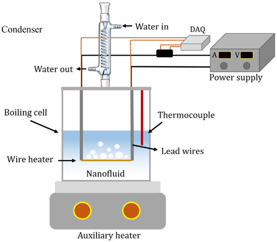 The experimental setup was previously developed and used for the pool boiling (PB) heat transfer performance of both HNFs and MNFs. The schematic of the setup is provided in Figure 3. Detailed information about the PB setup and operation conditions was presented in a prior study [27]. The accuracy of the PB setup was primarily checked and calibrated with DW, in addition to validating against relevant work in the literature under the same operation conditions [27]. The setup contained a heater located under the boiling chamber, a condenser on the top of the boiling chamber, a power supply, K-type thermocouples, and a data acquisition system. The NF samples were taken in the glass chamber for boiling with the possibility of bubble visualization. Furthermore, a horizontal wire made of Nickel-Chromium (Ni-Cr) was selected as a heating element, with dimensions of 4.27 cm long and a diameter of 250 micrometers.