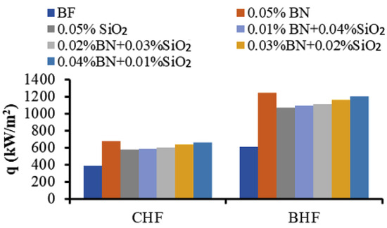 In addition, the burnout heat flux (BHF) for the MNFs and HNFs can be determined by analyzing the pool boiling curves and the maximum point (heat flux) of each curve where the wire was burnt. The BHF results were collected and compared with the CHF results, as shown in Figure 5. The improvements of the BHF were about 103% for BN MNF and 75% for SiO2 MNF. Accordingly, the BHF points of the MNFs and HNFs were increased in a similar way to the CHF points by increasing the concentration of BN NPs in the HNF and decreasing the concentration of SiO2 NPs. However, BHF points demonstrated higher enhancements than the CHF points in comparison to the related BF.