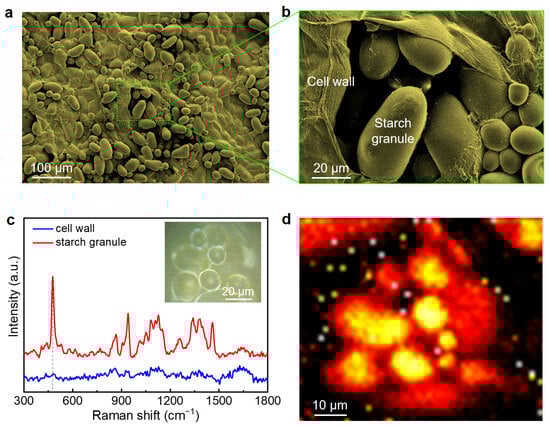 Potato cells mainly contain starch granules and cell walls, which makes it a simple plant cell structure for our study. Furthermore, starch granules exist in most plant cells and serve as the carbon storage; they are important starting materials for various industrial applications including biotechnology and biofuel production. The plant cell wall, which is composed of polysaccharides cellulose, hemicellulose, and pectin, acts as a semi-permeable layer that precisely permits the entry of smaller particles and inhibits larger ones. To examine the complete structural information of potato cells, common imaging characterizations such as scanning electron microscopy (SEM) and Raman spectroscopy were performed. To acquire the SEM imaging, potato samples needed to be fully dehydrated via chemical fixation due to the high vacuum chamber. Thus, the natural structure of the potato cells may be altered and structure artifact may be caused. Figure 1a,b shows the typical SEM images of potato cells. As shown in Figure 1b, the starch granules and cell wall were clearly observed. However, the cell wall structure was denaturized and even damaged due to the drying process.