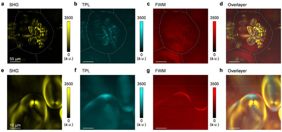 Next, we used nonlinear optical microscopy to perform simultaneous SHG-TPL-FWM optical imaging of potato cells. Figure 3a–d show the SHG, TPL, FWM, and overlaid SHG-TPL-FWM images of a potato cell, respectively. The cell walls were marked with white dotted lines. It was found that only potato starch granules were visible, while no structure information on the potato cell walls was observed. This observation was in accordance with the NLO spectra acquired in Figure 2b. Another interesting observation was that the SHG, TPL, and FWM images can provide different, yet complementary information to each other. Figure 3e–h displays the corresponding SHG, TPL, FWM images with a greater magnification in Figure 3a–c. It can be seen from Figure 3e,f that the distribution of TPL signal in the potato starch grains was complementary to that of SHG. A similar phenomenon was also observed in the collagen whose SHG and TPL signals highly depended on their spatial arrangement [28]. In comparison, FWM imaging (Figure 3g) had a relatively weaker contrast to that of TPL and SHG, with the strongest FWM signal distributed at the edge of the starch granules.