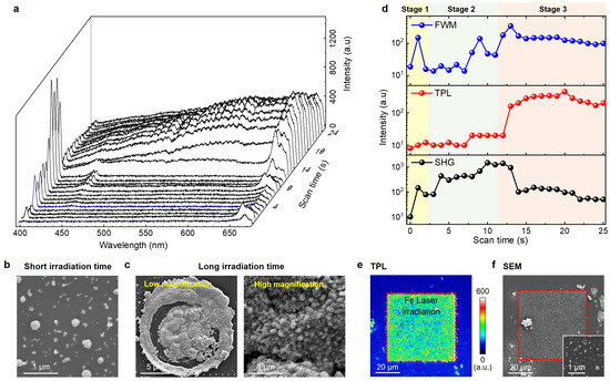 Previous studies have shown that noble metal ions, such as silver ions (Ag+), can be reduced to silver NPs via fs laser scan due to the multi-photon absorption or thermal effect [29,30]. To monitor the noble metal NP formation process and its nonlinear optical properties, we performed in situ, real-time nonlinear optical spectral measurements in a silver ion solution under a focused fs laser irradiation. Figure 4a shows the nonlinear optical spectra acquired on the fused silica substrate in the silver ion solution as a function of fs laser irradiation times. Each spectrum had an accumulation time of 0.2 s. At the beginning, weak SHG signals and a slight background signal measuring around 665 nm were observed since few silver NPs were formed (Stage 1). To confirm this, we performed a SEM imaging study (Figure 4b) where a few silver NPs with an average size of 140 nm were randomly formed on the substrate surface. As the fs laser irradiation time progressed, a significant SHG peak signal centered at ~400 nm, a TPL signal with a broad peak at 475–625 nm, and a broad FWM peak signal at ∼655 nm were observed. Figure 4d reveals the evolution of the nonlinear optical signals of the SHG, TPL, and FWM extracted from Figure 4a. With increasing laser irradiation time, the SHG signal (lower panel, Figure 4d) increased quickly and reached a maximum value at the time of ~10 s, reflecting that many silver nanoparticles were formed on the substrate (Stage 2). However, with further increasing laser irradiation time, the SHG signal decreased by an order of magnitude, which suggests that the silver NPs aggregated into cluster structures (Stage 3). As shown in Figure 4c, large aggregates composed of silver NPs were formed. For TPL (Figure 4d, middle panel), the signal slowly increased at the beginning, reached the maximum at around 15 s, and then maintained a stable and strong value with further laser irradiation. The FWM signal (Figure 4d, upper panel) had a similar trend to that of TPL, which took around 14 s to reach its maximum value. These analyses confirmed that within a short time of fs laser irradiation (just a few seconds), silver NPs with strong nonlinear responses were formed. In addition, the strong nonlinear optical responses were detected in the gold NPs (Figure S1), suggesting that fs laser-induced silver and gold nanostructures were suitable to be used as nanoprobes.