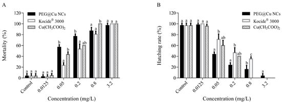 The 9 dpf mortality (A) or hatching rate (B) of embryos after exposure to PEG@Cu NCs, Kocide® 3000 and Cu(CH3COO)2 at concentrations of 0.0125, 0.05, 0.2, 0.8 and 3.2 mg/L. The hatching rate is zero, because all embryos died after exposure to 3.2 mg/L Kocide® 3000 or Cu(CH3COO)2. Values are shown as means ± SD (standard deviation). The mortality and hatching rate with different letter are significantly different (p < 0.05) for the same concentration of different fungicides.