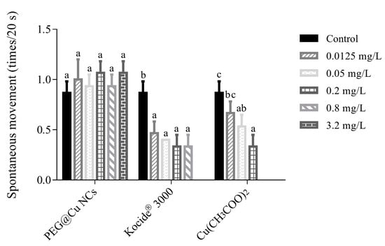 Spontaneous movement of zebrafish embryos after exposure to PEG@Cu NCs, Kocide® 3000 and Cu(CH3COO)2 for 48 h. Values are shown as means ± SD. Different letters indicate significant differences (p < 0.05) for the same fungicide.