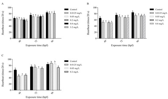 The heartbeat number in 20 s of embryos after exposure to PEG@Cu NCs (A), Kocide® 3000 (B) and Cu(CH3COO)2 (C) at different times. Values are shown as means ± SD. Different letters indicate significant differences (p < 0.05) at the same exposure time.