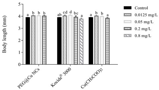Effects of PEG@Cu NCs, Kocide® 3000 and Cu(CH3COO)2 on body length of larvae at 216 hpf. Values are shown as means ± SD. Different letters indicate significant differences (p < 0.05) for the same copper fungicide.