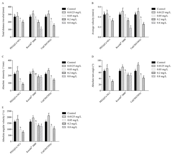 The behavioral parameters of total movement distance (A), average velocity (B), absolute sinuosity (C), absolute turn angle (D), and absolute angular velocity (E) of zebrafish larvae after exposure to PEG@Cu NCs, Kocide® 3000 and Cu(CH3COO)2 at different concentrations. Values are shown as means ± SD. Different letters indicate significant differences (p < 0.05) for the same copper fungicide.