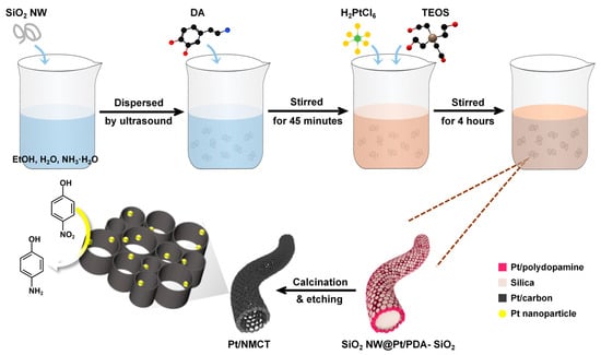 Recently, we reported a method for the preparation of nitrogen-doped mesoporous carbon nanotubes (NMCTs) through the co-deposition of PDA and silica on a sacrificial silica nanowire (SiO2 NW) [29]. Herein, we extended this “dual-silica template” strategy to the synthesis of ultra-small Pt nanoparticles-loaded N-doped mesoporous carbon nanotubes (Pt/NMCT) by combing the PDA-mediated one-pot co-deposition approach. The chloroplatinic acid (H2PtCl6, platinum source) introduced in the “co-deposition” step was fixed by the chelation of the amino group of PDA. During the subsequent carbonization process, the overgrowth of the Pt nanoparticles in the PDA skeleton was restricted, thus achieving the in situ loading of the ultra-small and uniformly dispersed Pt nanoparticles without the need for additional protective agents or reducing agents. The prepared Pt/NMCT had a high specific surface area, a large porosity, a hierarchical pore structure, and abundant nitrogen-doping. The loaded Pt nanoparticles had a uniform particle size (ca. 2 nm), and the content of Pt was 9.5 wt%. The chemical structure and morphological changes in Pt in the process of material synthesis were studied. Also, the catalytic performance was evaluated through the reduction reaction of 4-nitrophenol (4-NP) to 4-aminophenol (4-AP).