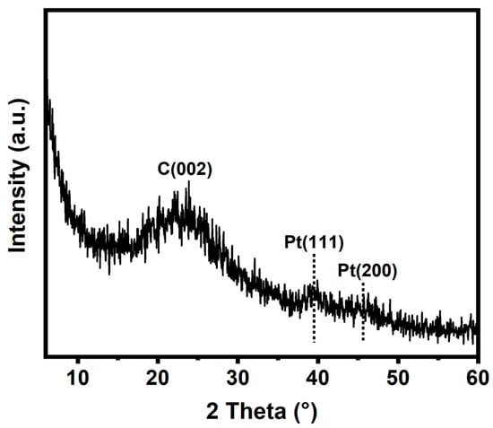 The crystal structure of Pt/NMCT was characterized by XRD. In the XRD pattern of Pt/NMCT (Figure 3), the material exhibits diffraction peaks at around 39.8° and 46.2°, corresponding to the (111) and (200) crystalline planes of Pt, respectively [32]. The weakening and broadening of the XRD diffraction peak also confirm the small particle size of Pt nanoparticles [20]. The wide diffraction peak near 23° is due to partially graphitized carbon [33].