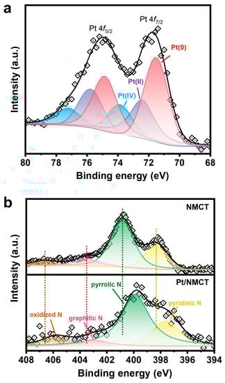 (a) Pt 4f high-resolution X-ray photoelectron diffraction spectra (XPS) of Pt/NMCT; (b) N 1s XPS of NMCT and Pt/NMCT.