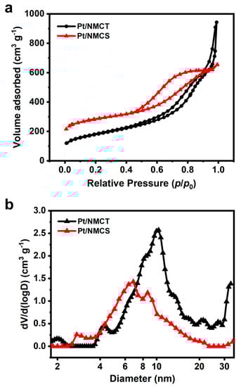 To demonstrate the advantage of hollow structure in Pt/NMCT, a control sample of Pt nanoparticle-loaded nitrogen-doped carbon nanospheres (Pt/NMCS) was prepared without adding the SiO2 NWs as a template. As shown in Figure S2, the particles of Pt/NMCSs are highly agglomerated, and their mesopores are loaded with abundant Pt nanoparticles. The N2 sorption isotherms and pore size distribution curves (Figure 5) show that Pt/NMCS has less macroporosity and smaller mesopores than Pt/NMCT. Additionally, Pt/NMCS has a smaller pore volume (1.01 cm3 g−1) but a larger BET specific surface area (1032.6 m2 g−1) than Pt/NMCT due to the smaller mesopores and more abundant micropores that exist in Pt/NMCS.