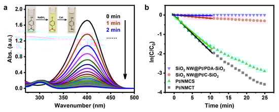 In order to further illustrate the structural advantages of the materials prepared by the dual-silica template method and the necessary calcination to obtain active Pt species, we also investigated the performance of the control catalysts in the 4-NP reduction reaction, i.e., Pt/NMCS, the silica-retained sample SiO2 NW@Pt/C-SiO2, and the uncalcined sample SiO2 NW@Pt/PDA-SiO2. The curve between ln(ct/c0) and t obtained from UV-vis spectra is shown in Figure 8b. By calculating the slopes of the fitting curves, the apparent rate constants of SiO2 NW@Pt/PDA-SiO2, SiO2 NW@Pt/C-SiO2 and Pt/NMCS are 0.003, 0.017 and 0.160 min−1, respectively. The catalytic performance of Pt/NMCS is slightly worse than that of Pt/NMCT (0.184 min−1). Although Pt/NMCS has a higher surface area, which is normally beneficial to improving the catalyst activity, the longer diffusion pathway and the lack of macropores in Pt/NMCS may restrict the diffusion of guest molecules, thereby causing the inferior activity of Pt/NMCS [50]. Also, SiO2 NW@Pt/C-SiO2 shows significantly lower catalytic activity than Pt/NMCT due to the less porous structure of SiO2 NW@Pt/C-SiO2 without removal of the silica template. The worst activity was found in SiO2 NW@Pt/PDA-SiO2, which suggests that oxidized Pt is less active than the reduced one in this reaction.