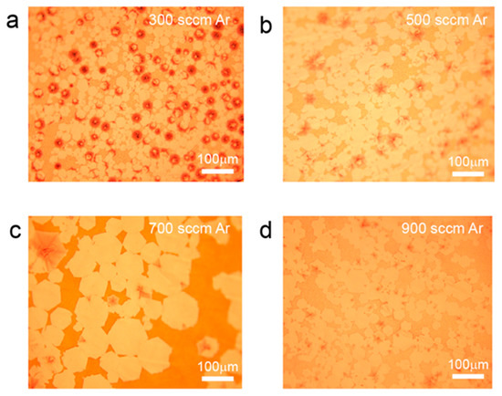 Further investigation was conducted by controlling the carrier gas flow rate to study the effect of gas flow on the preparation of interlayer-coupled multilayer graphene. As shown in Figure 4a, when the Ar gas flow rate is relatively low (300 sccm), the carbon source supply is in excess, resulting in the formation of nonuniform onion-like multilayer graphene [21,35]. When the Ar gas flow rate is increased (500 sccm), the proportion of Ar gas also increases, leading to a reduction in the actual carbon source supply during graphene growth. As a result, the nonuniform layered onion-like graphene disappears, and single-layer graphene coexists with umbrella-shaped interlayer-coupled multilayer graphene (Figure 4b) [36]. When the Ar gas flow rate continues to increase (700 sccm), a decrease in the proportion of umbrella-shaped graphene is observed, and interlayer-coupled multilayer graphene with tails starts to appear (Figure 4c). Furthermore, when the Ar gas flow rate is further increased (900 sccm), the emergence of large areas of interlayer-coupled multilayer graphene with tails is observed (Figure 4d). This may be attributed to a dynamic equilibrium growth state achieved by diluting the actual carbon source supply under the combined effect of an increased gas flow velocity and an increased Ar gas proportion.