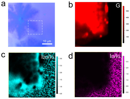 (a) Optical photograph of the sample with carbon species continuing to accumulate at the edge of graphene domains, (b–d) Raman mapping spectra of the G peak and I2D/IG and ID/IG ratios at the position indicated by the white dashed box in Figure (a).