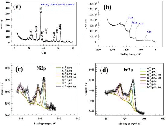 Furthermore, X-ray photon spectroscopy (XPS) characterized the oxidation states and types of bonds between atoms. Figure 1b shows an introductory survey of the NiFe2O4, which displays the presence of Ni, Fe, O, and C at a binding energy of 857.38, 712.35, 285.81, and 532.07 eV, respectively. The XPS spectra of the NiFe2O4 elements are displayed in Figure 1c–f. As shown in Figure 1c, Ni2P spectra were observed to have characteristic peaks at 855.5 and 857.76 eV, corresponding to 2p3/2 Ni+2 and Ni+3 peaks. The peaks observed at 862.1 and 865.62 were due to satellite of Ni 2p3/2 [58]. The peaks observed at 873.15, 876.67, and 880.14 eV were also attributed to Ni 2p1/2 and its satellites. Figure 1d displays the XPS spectra of the 2p core level of Fe. The spectra showed Fe2p signals at 710.69 and 713.08 eV, which are attributed to Fe2p3/2. Furthermore, peaks were observed at 716.47 and 719.88 eV for 2p3/2 satellites [59]. The peaks at binding energies of 724.34, 727.79, and 732.61 eV are attributed to Fe2p1/2 and its satellite.