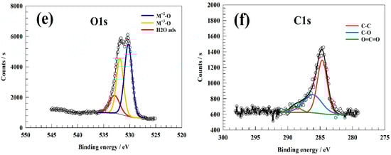 The origin of oxygenated Ni and Fe bonds can be ascribed by the peaks at 530.28 and 531.87 eV in Figure 1e. The peak observed at a binding energy of 532.91 eV is attributed to the water molecules that were adsorbed on the surface of the catalyst [60]. Figure 1f depicts the C1s spectra. Three distinct peaks were detected in the C1s spectra at binding energies of 284.83, 285.32, and 288.58 electron volts. The spectral peaks detected at 284.83 and 285.32 electron volts are indicative of a carbonaceous layer that is typically present on the surfaces of air-exposed samples. The third peak observed at a binding energy of 288.58 eV indicates the existence of metal carbonate, as reported in previous studies [61,62].