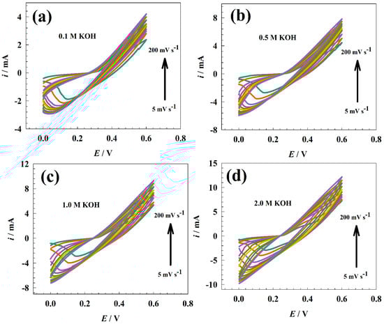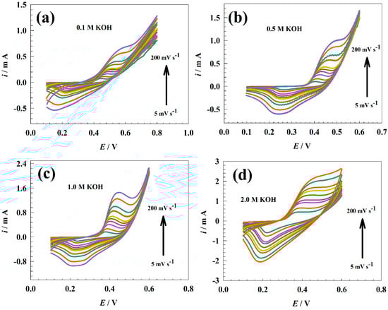 The functionality of the modified GC/NFO electrode was examined in several KOH solutions. Figure 6 shows the CVs of the modified GC/NFO electrode at various scan rates (5 to 200 mV s−1) in various alkaline medium ranges (0.1 to 2.0 M). Increased scan rates of CNT-based composites impact the delineation of the NiOOH/Ni(OH)2 redox peak when compared to NFO@CNT. As opposed to the faradic current, the presence of CNTs increased the capacitive current.