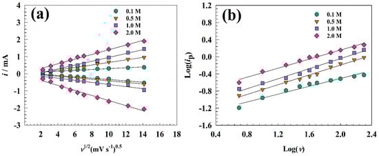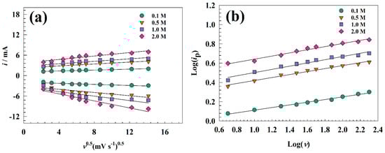 Since Randles–Sevcik relation should take the diffusion of into account, the anticipated diffusion coefficients for modified GC/NFO electrodes are 6.33 1, 1.87 10−5, 2.84 1, and 3.44 1 cm2 s−1 for 0.1, 0.5, 1.0, and 2.0 M, respectively. For comparison, the mixed capacitance was calculated using the relation shown in Figure 7b and Equation (4). The slope of w was calculated to be 0.48, 0.51, 0.57, and 0.53 for electrolyte concentrations of 0.1, 0.5, 1.0, and 2.0 M, respectively. Therefore, the supplied value of the b slopes suggested that the bulk faradic process was used as the storage mechanism on the modified GC/NFO electrode.