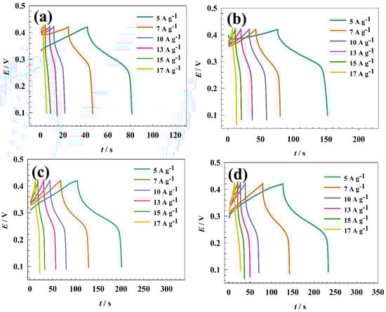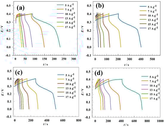 GCD of GC/NFO@CNT in a solution of (a) 0.1, (b) 0.5, (c) 1.0, and (d) 2.0 M KOH.