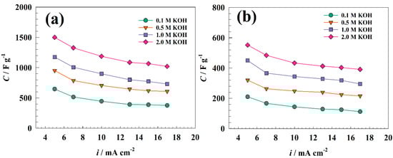 Figure 10 shows the relation between the charging current and capacitance of different electrode surfaces in various electrolyte concentrations. Thus, change in capacitance with the current was illustrated for GC/NFO@CNT (see Figure 10a). This is provided that rate capabilities for different electrolytes are 58, 63, 62, and 68% for 0.1, 0.5, 1.0, and 2.0 M, respectively. Figure 10b displays the relation between capacitance and current for modified GC/NFO electrodes. The rate capabilities are estimated as 53, 67, 65, and 70% for 0.1, 0.5, 1.0, and 2.0 M, respectively. Reduced charge and discharge times, which restrict charge diffusion in the films, may be owed to the drop in specific capacitance observed at high current densities [67].