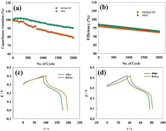 Study of different electrode durabilities for 2000 cycles (a) capacitance retention (%), and (b) columbic efficiency. Comparison between the 1st and the 2000th cycle of (c) GC/NFO@CNT and (d) GC/NFO electrodes.