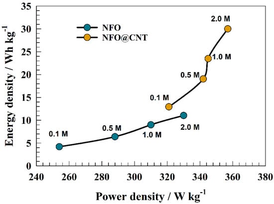 Additionally, modified GC/NFO@CNT and pristine GC/NFO were compared using a Ragone plot (Figure 12). The increases in both energy density and power density were observed with electrolyte concentration. Whereas, the highest power and energy densities were observed at 2.0 M of KOH. The provided values of energy density and power density were (11.2 Wh kg−1, 330 W kg−1) and (30.2 Wh kg−1, 357 W kg−1) for pristine and modified NFO, respectively.