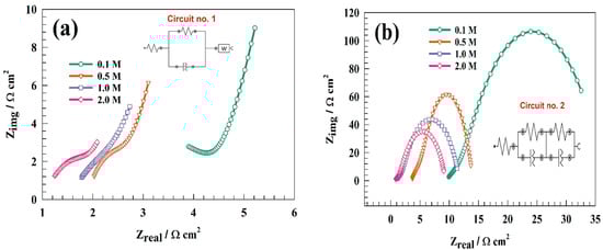 Additionally, Nyquist data were fitted as represented in the circuit-illustrated inset in Figure 13b. The fitting circuit included Rs, corresponding to the resistance of the solution, R1, and R2, attributed to the outer and inner layer resistances, respectively. Relatedly, Q1 and Q2 can be established as constant phase elements for the outer and inner surfaces, respectively. The estimated EIS parameters for modified GC/NFO electrodes in different KOH concentrations are listed in Table 3. Whereas, higher KOH concentrations lead to higher faradic currents and consequently lower charge transfer resistances.