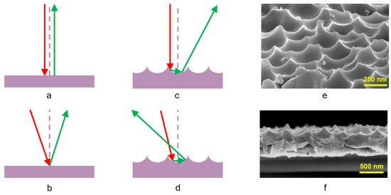 (a–d) Schematic representation of increasing absorption in ultra-thin Si solar cells using a T-NC Al film. The effect results from elongating the optical path inside the active silicon layer. Here, (a,b) represent cases when light reflects from a plain Al surface [LR ~ LT]; (c,d) represent cases when light faces multiple reflections from a T-NC Al film surface, resulting in a longer optical path [LR1 + LR2 + … > LT]. The red and green lines represent incident and reflected light, respectively. (e) SEM image of the T-NC Al film fabricated by our group [23]. Scale bar: 250 nm. (f) Lateral SEM image of same T-NC Al film. Scale bar: 500 nm. The manufacturing process is fully described in [17].