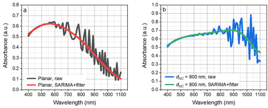 Example of employing SARIMA + filter on coherent simulated absorbance spectra of PV cell with 3000 nm thick active layer: (a) planar Al substrate; (b) T-NC Al substrate with dNC = 800 nm.