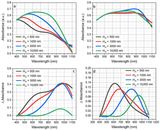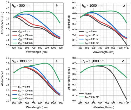 Added to the forgoing, the absorption range is directly dependent on the thickness of the active layer. Figure 5c shows the absolute difference in the total optical absorbance of simulated thin and ultra-thin Si PV cells with planar Al- and T-NC-modified substrates with varied thicknesses of the Si active layer (HSi = 500 nm to 10 µm) and dNC = 800 nm. As shown in Figure 5d, the peak absolute difference in absorbance was observed at λ = 950 nm: there was an about 42% gain over the structure with a flat aluminum layer, regardless of the thickness of the active silicon layer. Interestingly, the peak absorption difference in the active element (shown in Figure 5d) migrated from the visible to the near-infrared range as the active layer thickness increased. The maximum absorbance difference inside the Si active element with a thickness of 500 nm was at λ = 620 nm. On the other hand, for structures where HSi = 1, 3, and 10 microns, it was at 680, 850, and 950 nm, respectively. The absolute increase in the average absorbance of T-NC with 800 nm NCs over planar Al was 27.3, 23.2, 17.8, and 2.6% for HSi = 500 nm, 1 µm, 3 µm, and 10 µm, respectively.