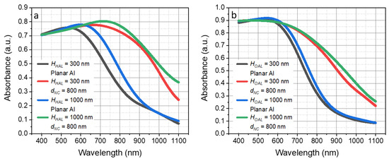 As in the case of the silicon active layer, the absorption in the cells with the FAPbI3 perovskite active layer increased for both material thicknesses (shown in Figure 6a), and the effect was stronger for thinner perovskite layers. For 300 nm and 1000 nm thick FAPbI3 layers, the average absorbance increased by 45.8 and 37.5%, respectively. Similar to the case with silicon active layers, the difference in average absorbance between the PV cells with 300 nm and 1000 nm thick active layers dropped from 11.0 to only 4.6%. It is important to mention that the sole enhancement of the light absorption is not the only mechanism to increase the efficiency of perovskite solar cells where the large increase in the final efficiency of a cell has been observed due to the plasmon effect related to the influence of metallic components on the internal electricity of a cell [49,50,51]. However, the current study focuses on Al nanostructures, where the localized surface plasmon resonance (LSPR) affects the ultraviolet (UV) wavelength region below 400 nm [24,52]. Covering the T-NC nanostructure with an ultra-thin (5–10 nm) layer of another metal such as gold (Au) or silver (Ag) onto the T-NC nanostructure can shift the plasmonic effect from the UV towards the visible wavelength range [49].
