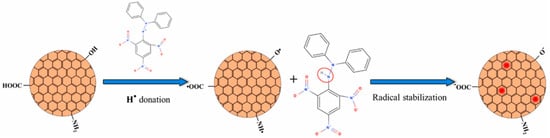 C-dots can break down reactive nitrogen species (RNS) and hydroxyl radicals (•OH) [28]. First, C-dots possess anti-radical activity towards RNS (i.e., NO• and ) which can interfere with cellular activity. The antioxidant activity is assessed via evaluating free radical content of a solution containing C-dots and comparing it to that in a solution without C-dots (control). The standard molecule is the 1,1-Diphenyl-2-picrylhydrazyl radical (DPPH•), a nitrogen-centered free radical whose nitrogen has two lone-pair electrons surrounded by three benzene rings. The possible scavenging mechanism involves hydrogen transfer from C-dot surfaces to DPPH• [27] (Figure 2). The presence of carboxyl (–COOH), hydroxyl (–OH), and amino (–NH2, –NH–) groups allows the hydrogen transfer and the reduction of DPPH• to DPPH–H [27]. Unpaired electrons on the C-dot surfaces can be delocalized through resonance in aromatic domains or through chemical bond rearrangement. In contrast, the blue fluorescence of C-dots can be quenched by an electron transfer mechanism, in which nitroxide radicals act as electron acceptors [27]. Secondly, C-dots can scavenge the •OH radicals, one of the primary sources of oxidative stress in biological systems, thus preventing oxidative damage to biomolecules (e.g., lipids, proteins, and DNA) caused by •OH radicals [27]. Specifically, C-dots can undergo electron transfer reactions with •OH, resulting in the conversion of the •OH radical into a less reactive molecule that effectively eliminates the radical [27]. In addition, C-dots can participate in redox cycling, where they alternate between the oxidation and reduction states in scavenging reactions. This cycling enhances the efficiency of neutralizing multiple •OH radicals [29,30]. Furthermore, C-dots possess unique photoluminescent properties owing to their quantum confinement and surface states. The excited states of the C-dots can interact with singlet oxygen molecules, which are ROS radicals that are highly responsible for oxidative damage, thus reducing the possibility of singlet oxygen formation [29,30]. The quenching of the excited-state C-dots plays an essential role in their antioxidant properties [28,31].